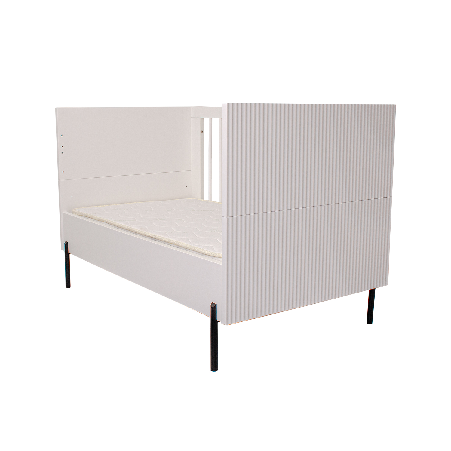 The Waves Cot combines smooth lines, a crisp white finish, and modern metal legs to create a calming centrepiece for your nursery. Inspired by the natural beauty of the beach, its gently wavy ends echo the movement of the ocean, adding a unique touch of coastal charm. Designed with versatility in mind, it features adjustable mattress heights for both comfort and safety as your little one grows. When the cot stage is over, the Waves Cot easily converts into a toddler bed or day sofa, providing a cosy space for rest and relaxation well beyond the early years.